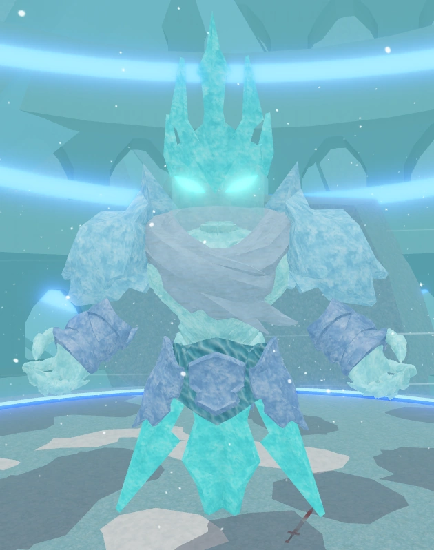 Ice Pentagrams: The Frostbite King will form three small pentagrams at random positions, which damage the players if touched. The center of each pentagram is safe as attacks do not appear there, although players are advised to stay outside the pentagrams, if possible, to help avoid other attacks. Snowflake Saws: The Frostbite King will create three snowflakes on the ground that act as saws and target random players by creating target lines. The snowflakes will quickly move toward the end of the targeted position and deal rapid damage to players that it touches. Frost Circles: While the Snowflake Saws are moving, frost circle will spawn on random players. They will appear five times each dealing damage. Players will need to constantly move to not take any damage (this attack is very similar to the Blightwyrm's attack). Impaled Stones: Crude stone spears will appear from the ground. If a player is impaled by the stone spears, they will be rooted and cannot move. Frostbite Wall: After the stones appear, a Frostbite Wall appears, splitting the arena into two. Once it is fully formed, the wall will rotate counterclockwise by 180°. Players that touch the wall will be dealt with rapid damage. During the fight, the arena will be slippery, which will then affect the player's movement. After rotating, the wall is lowered and the attack cycle repeats. |